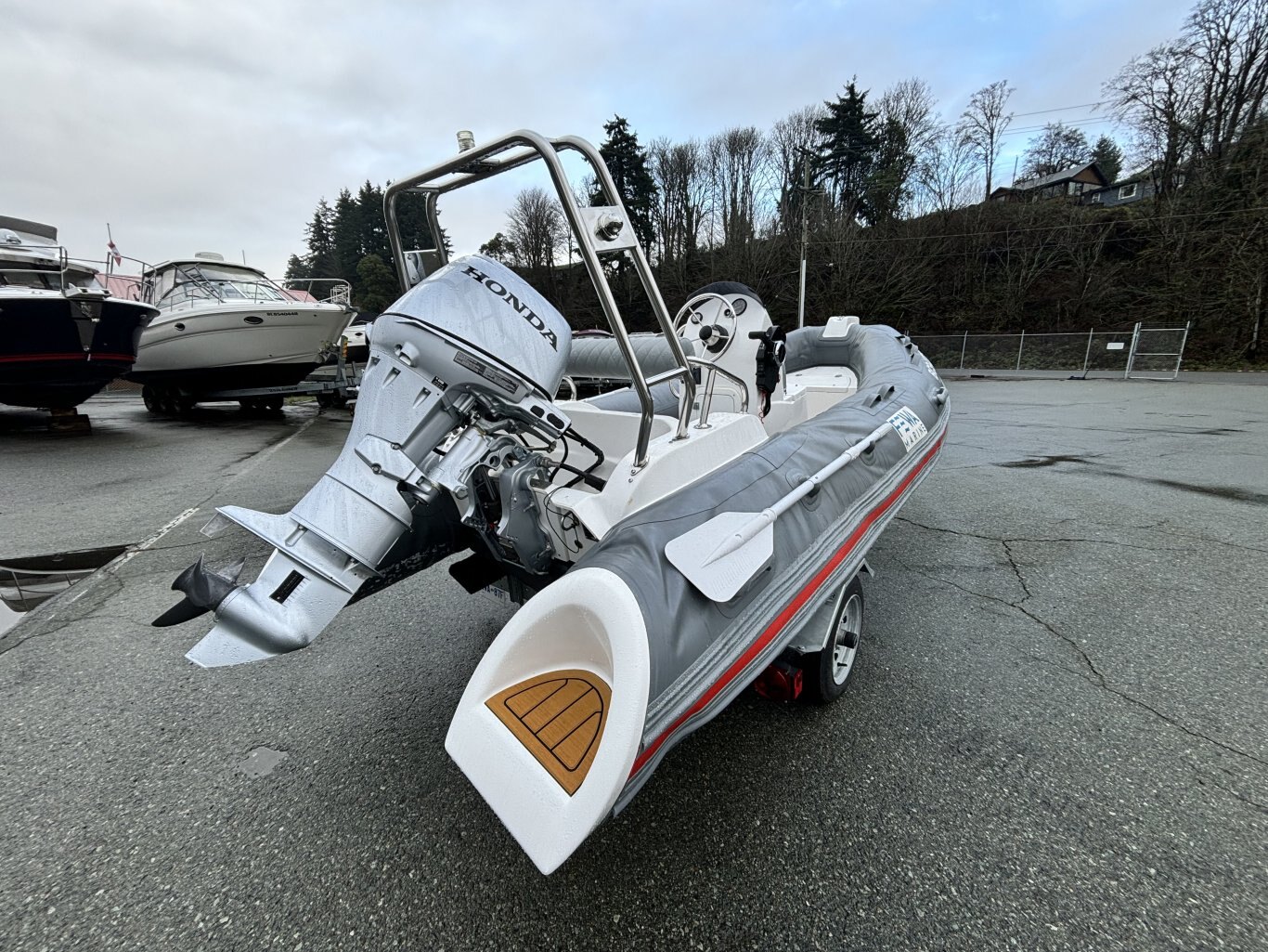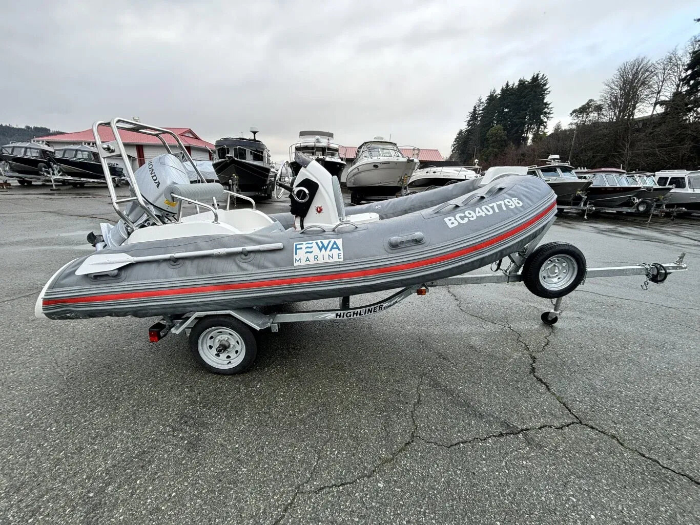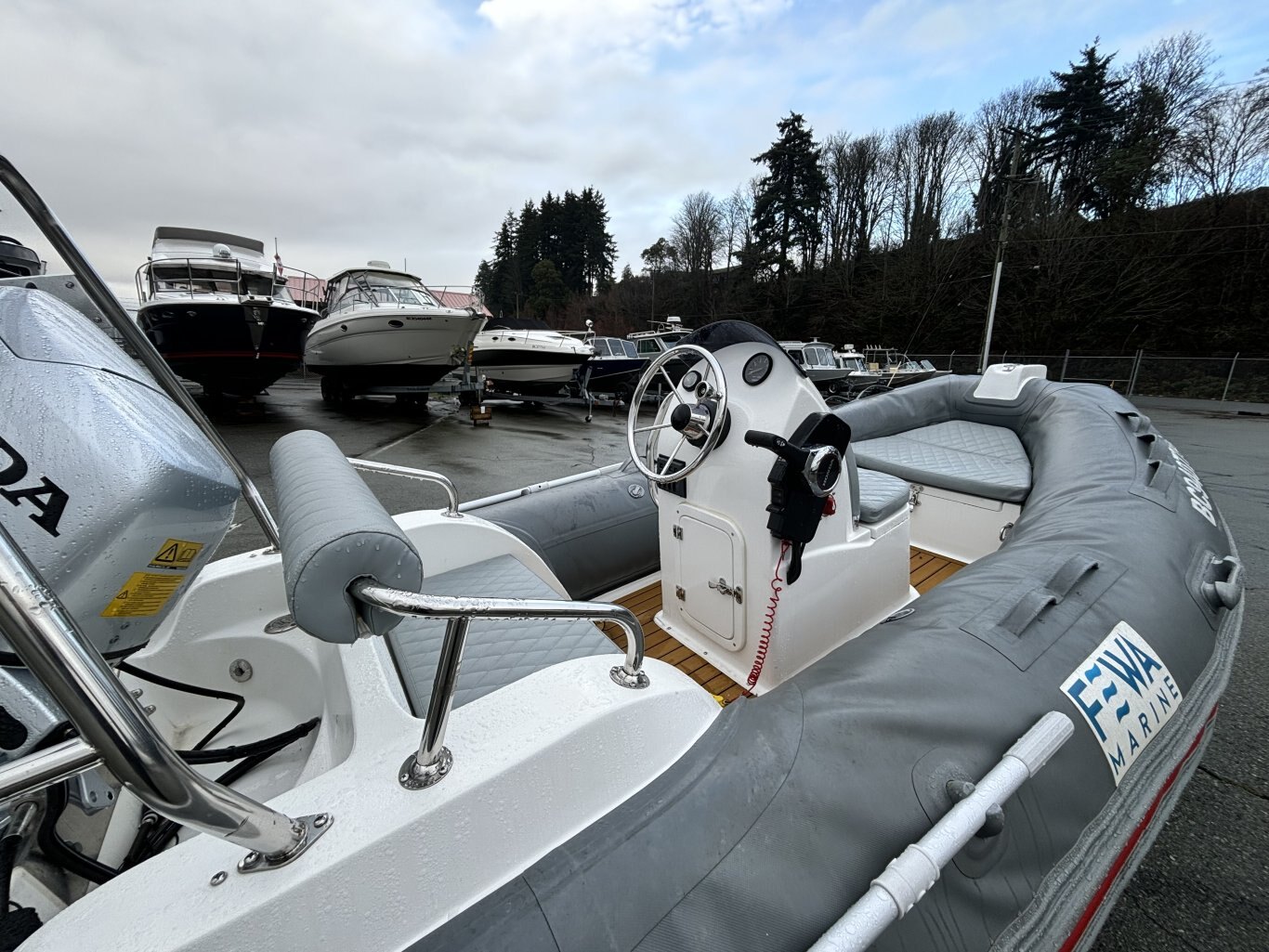 Fewa Marine RIB 390 rigid inflatable is great condition. This 13-foot boat has a solid fiberglass hull with inflatable tubes, giving it a stable and comfortable ride. Center console layout with seating as grab rails. Rated for up to 7 people and a 30HP ouboard. Easy to tow, launch, and store thanks to it's compact size. A versatile boat that works well for a cruise or as a tender.