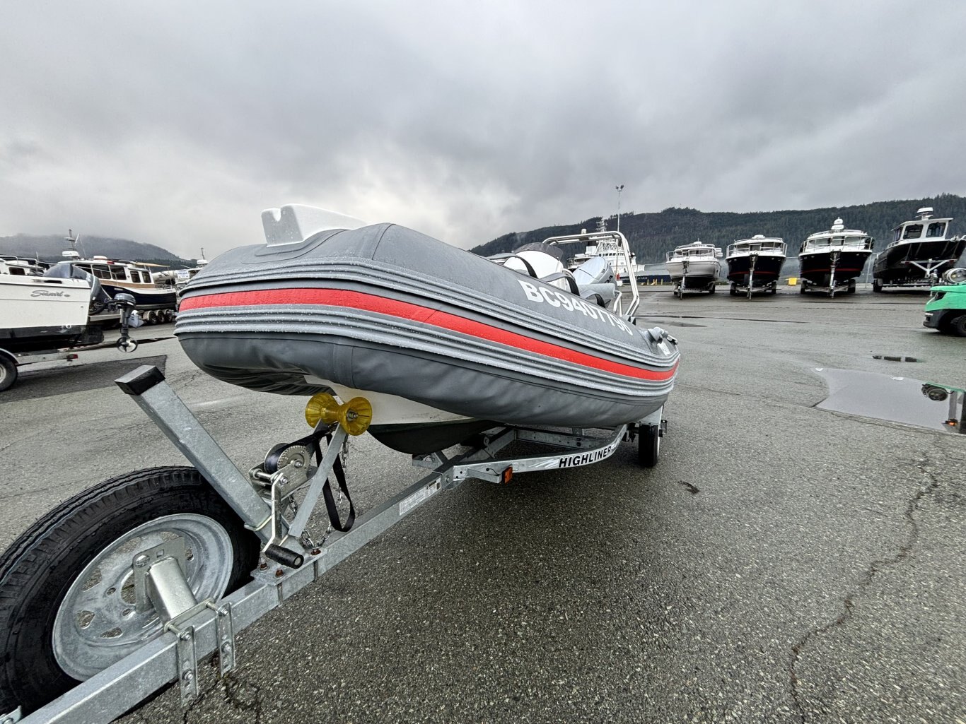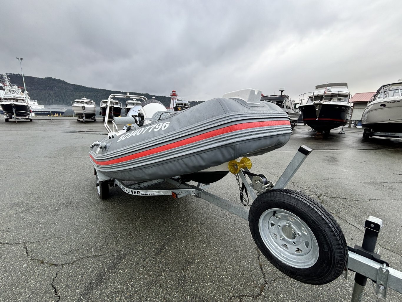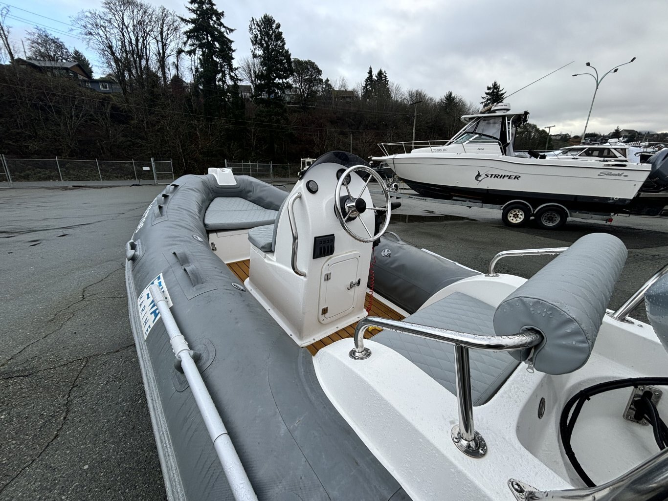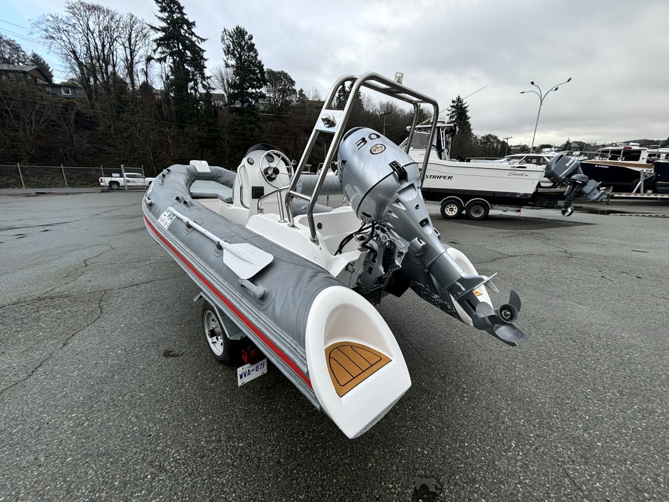 Fewa Marine RIB 390 rigid inflatable is great condition. This 13-foot boat has a solid fiberglass hull with inflatable tubes, giving it a stable and comfortable ride. Center console layout with seating as grab rails. Rated for up to 7 people and a 30HP ouboard. Easy to tow, launch, and store thanks to it's compact size. A versatile boat that works well for a cruise or as a tender.