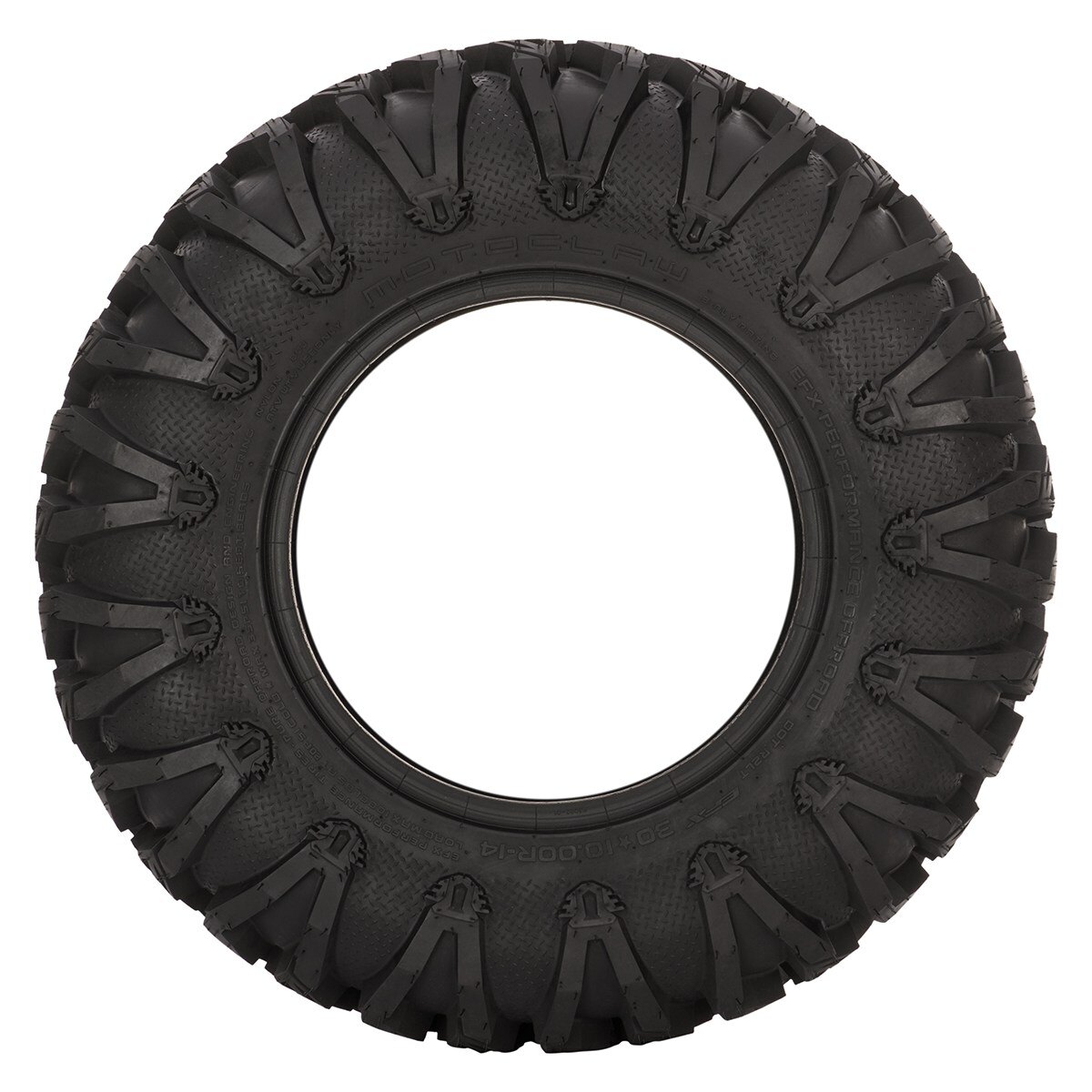 Tire sidewall feel is stiffer and harder to bottom on a trail obstacle such as a rock or tree root - increasing the durability feel Increased sidewall stiffness - flatter cornering feel The 30" version on the MotoClaw provide a noticeable increase in ground clearance, which really makes a difference when maneuvering through large ruts and rolling over large rocks on rough trails with less chassis movement and driver effort With the increased weight of these larger tires, there's reduced kicking feel on jumps and water bars 8 Ply radial construction is next level tough to help deal with nasty terrain 1" tread depth and an intermediate tread design that covers a wide range of terrain with superior traction - from tacky dirt in the eastern woods to loose, rocky mountain trails to hard-packed western deserts Front/Rear - 30", 8-Ply Radial; Size: 30x10-14R; Weight: 41.8 lbs.; O.D.: 30"; Lug: 1"; Load Index: 1000 lbs.; Speed Rating: 80J; PSI: 20; Rim: 14"; Terrain: Trail, A/T Each sold individually GYTR® Torque Assist Gear Kit is required when installed on the 2016