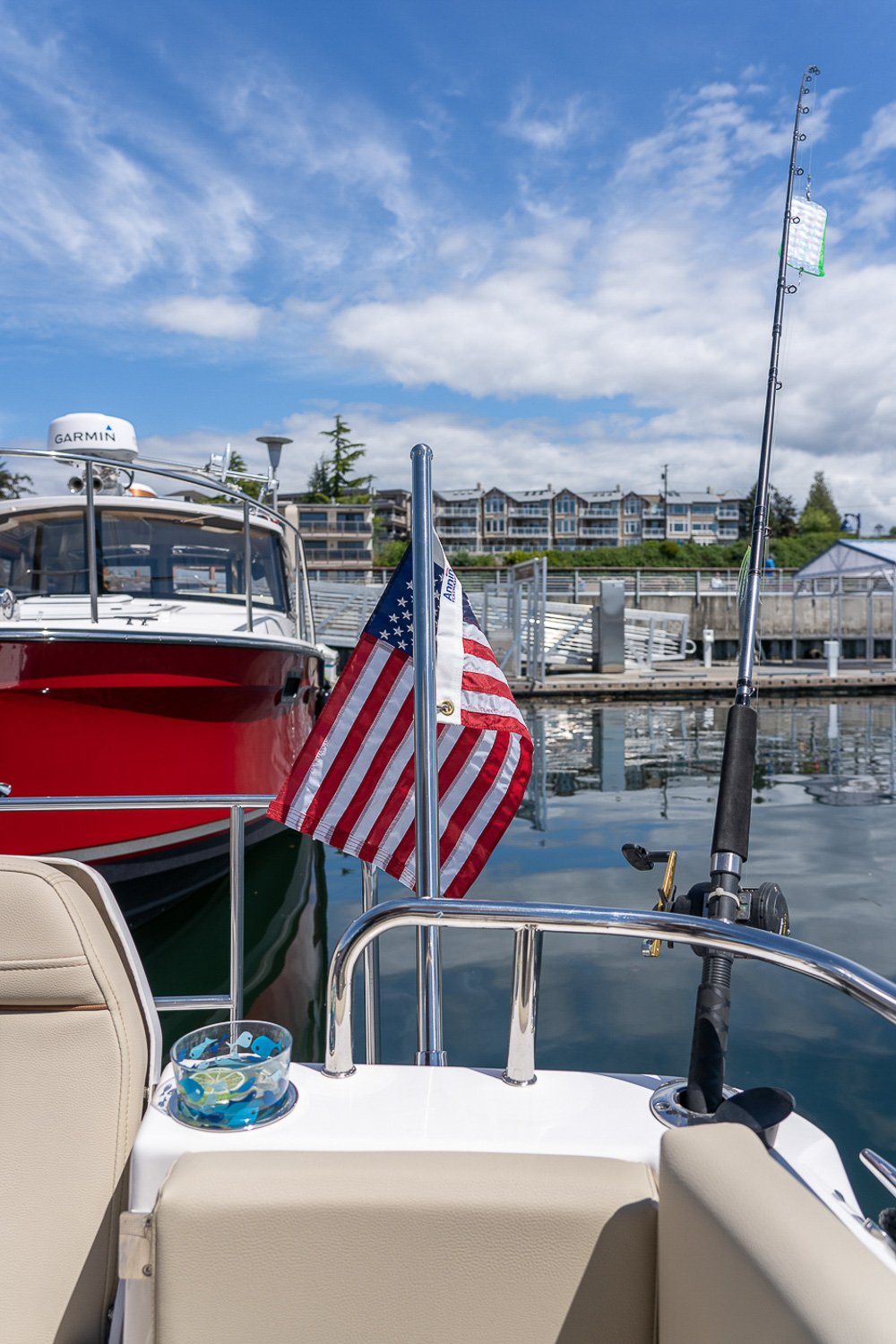 The Ranger Tugs R-29 CB (Command Bridge) offers all of the innovative features that we’ve incorporated into the beautifully designed R-29 S but also adds the comfort, convenience, and excitement of a command bridge. The new command bridge features seating for four and a full suite of electronic controls including VHF, bow & stern thruster controls, Volvo engine controls, spotlight remote, lighted compass, and Garmin autopilot and Navigation system. Access to the bridge is achieved by climbing the teak steps in the aft cockpit area. On the bridge you’ll also find convenient grab rails for safety, 12v power, cupholders, and weatherproof speakers.