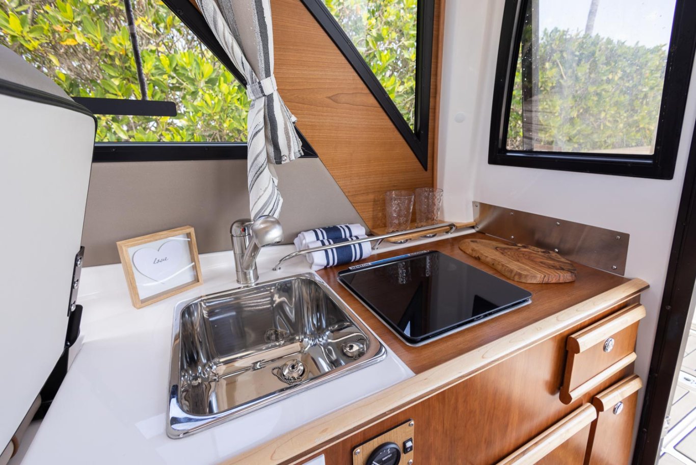 The forward stateroom features wrap around seating and a high/low table that drops to complete the forward berth for a comfortable night’s sleep. The main salon has a dinette for four that transforms into an additional berth for two. Below the dinette there is a mid-berth perfect for kids or additional storage.