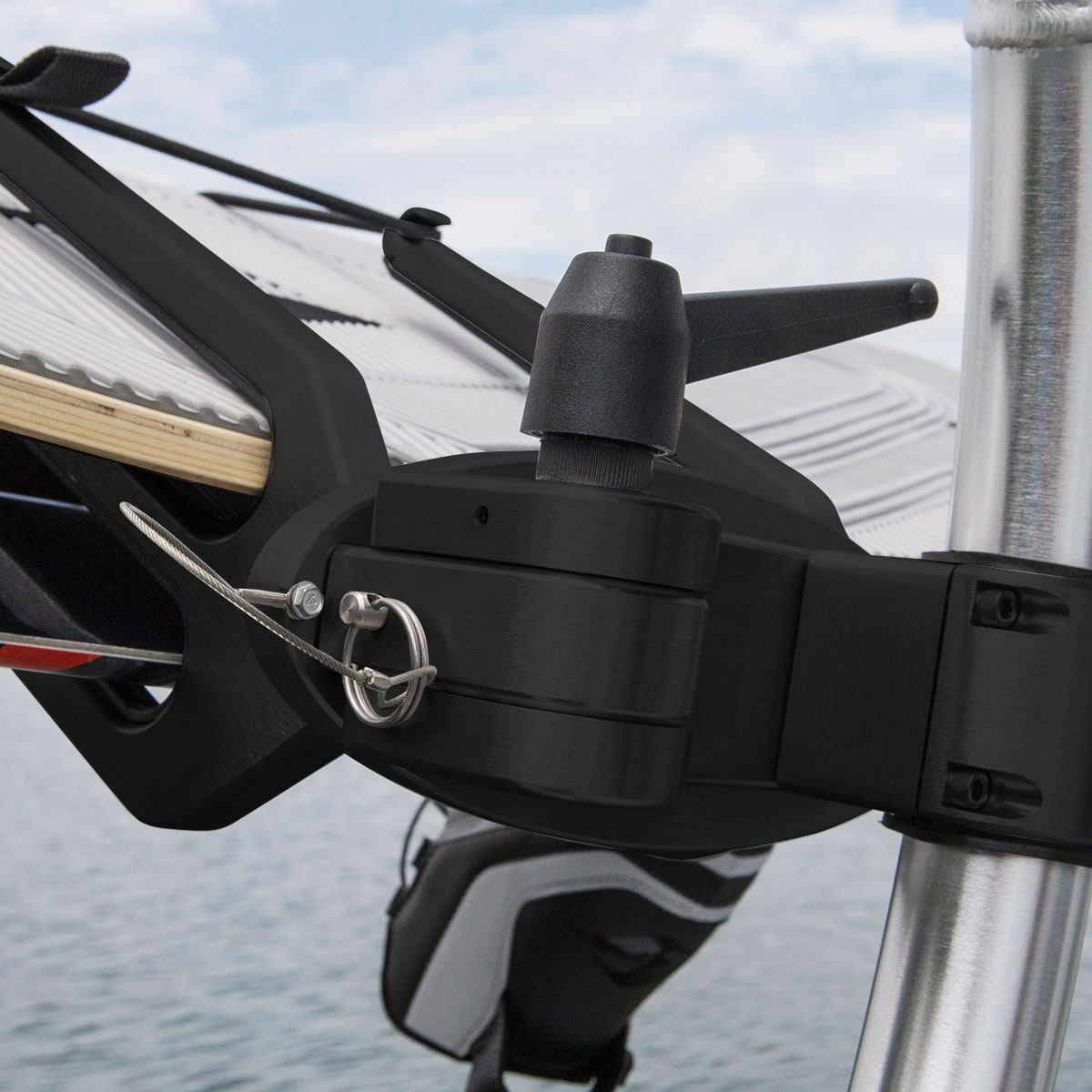 For the ultimate in convenience when installing or removing your wakeboards. With the twist of the contoured rubber-coated knob, the forks swivel back and into the boat to gain easy access.