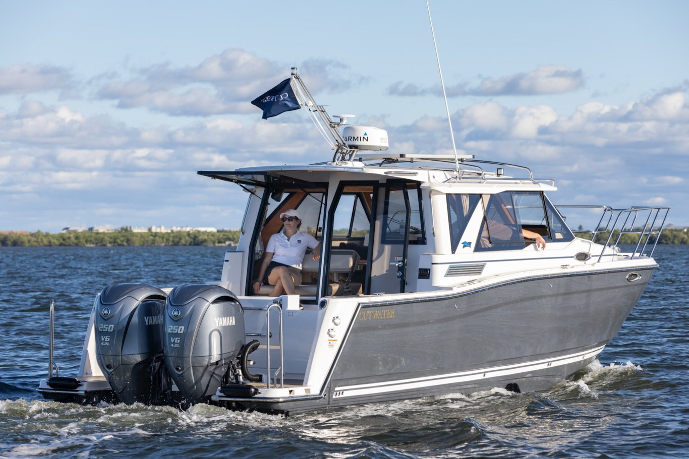True to the Do-It-All nature of Cutwater Boats, the C-288 C is loaded with premium features as standard equipment, providing unsurpassed versatility. The contemporary Downeast design is set to turn heads wherever she'll roam, and avid cruisers will appreciate the abundant power produced by the twin counter-rotating Yamaha F250 outboards. The C-288's advanced hull design delivers the perfect blend of performance, comfort and efficiency thanks to the double-stepped deep-V hull, Laminar Flow Interrupters and a stout 10' beam. The generous beam maximizes cabin area and on-water stability while remaining trailerable. Boarding is made safe and easy with our Clear-Path swim platform which fully wraps around the outboard engines. In the cockpit, you'll find ample storage, rod holders, beverage holders, livewell, electric grill and more. The cockpit transforms into a social space providing seating for six with the convertible sunset seat, fold down gunwale seats and an opening glass bulkhead lounge. The overhead solar panel and sport racks allow for extended cruising and storage for SUPs, kayaks, bikes and more. Step inside the salon and you'll find your home on the water, with a full galley featuring a stovetop, stainless-steel sink with pull-out rinse faucet, fridge/freezer combo, microwave convection oven, cabinetry, and a wine/water cooler. The helm is a Captain's dream with a Garmin chartplotter, Autopilot, sonar, xH D radar, color engine displays and a twin-lever electronic throttle control. You'll remain comfortable in any weather with the climate-controlled interior featuring sliding overhead hatches and opening portlights. Separate accommodations for six include a forward stateroom, spacious mid-berth and a private head with shower. The C-288 Coupe is the complete package for extended cruising, fishing, remote work, and more.