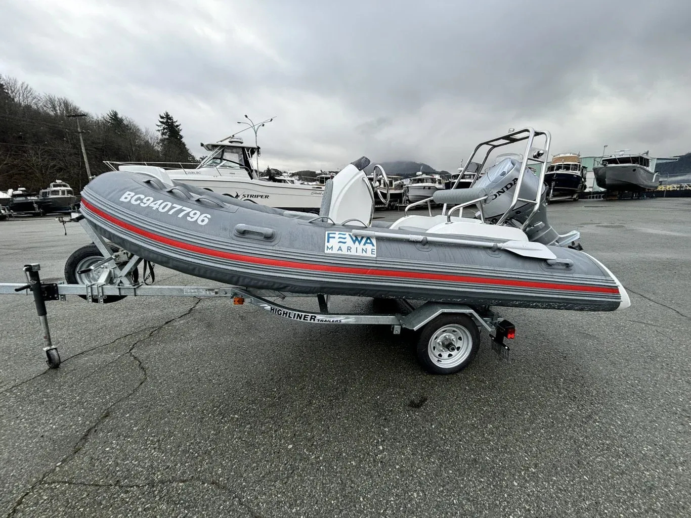 Fewa Marine RIB 390 rigid inflatable is great condition. This 13-foot boat has a solid fiberglass hull with inflatable tubes, giving it a stable and comfortable ride. Center console layout with seating as grab rails. Rated for up to 7 people and a 30HP ouboard. Easy to tow, launch, and store thanks to it's compact size. A versatile boat that works well for a cruise or as a tender.
