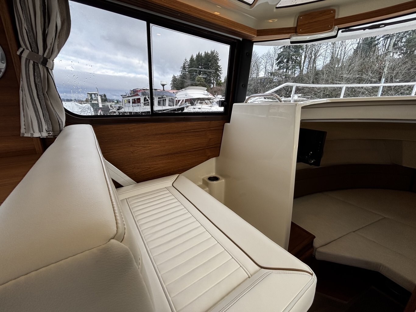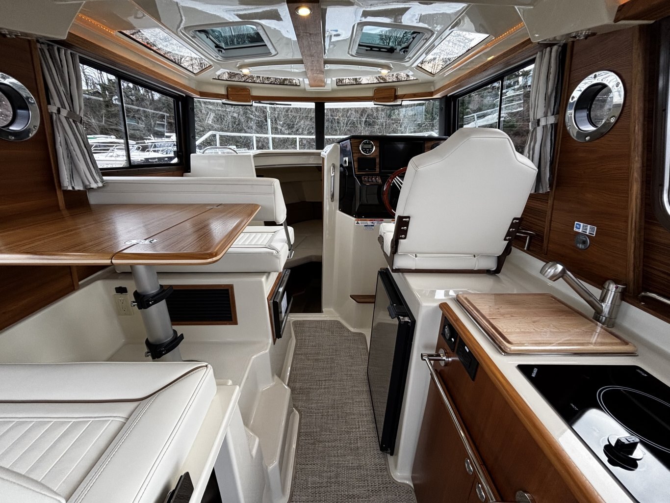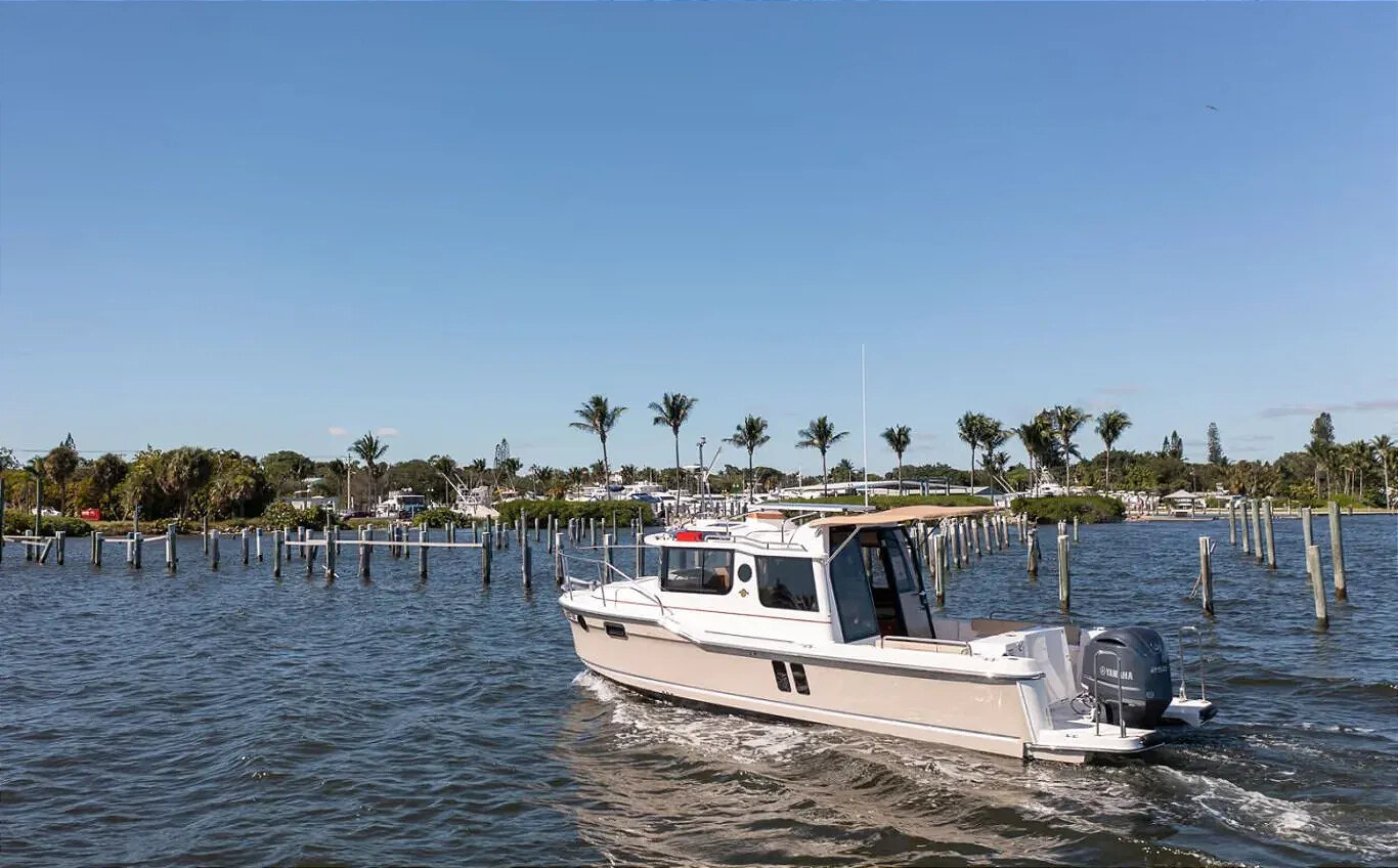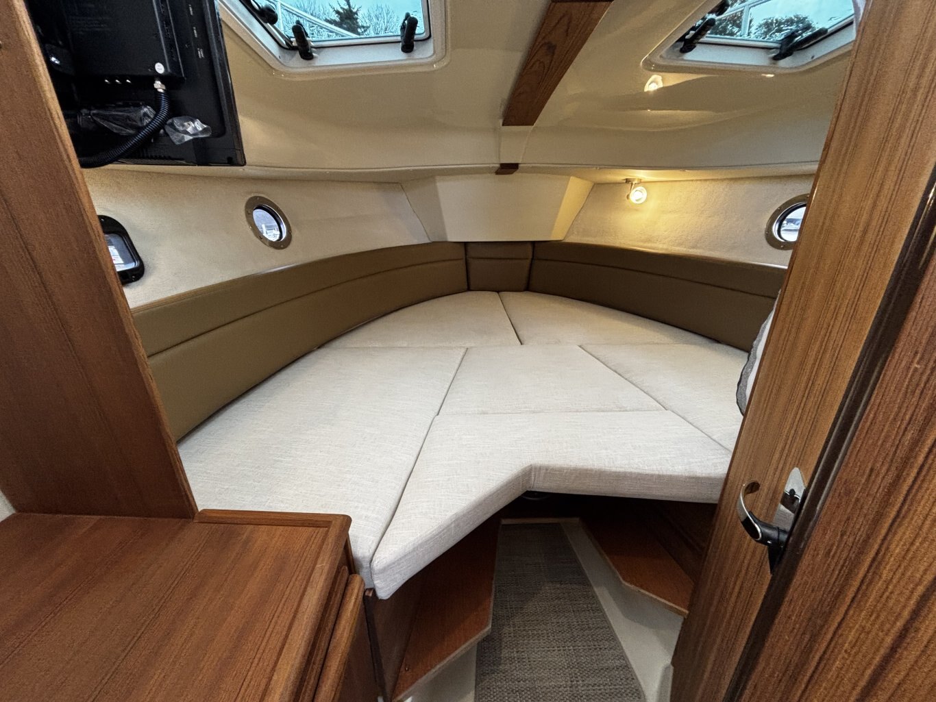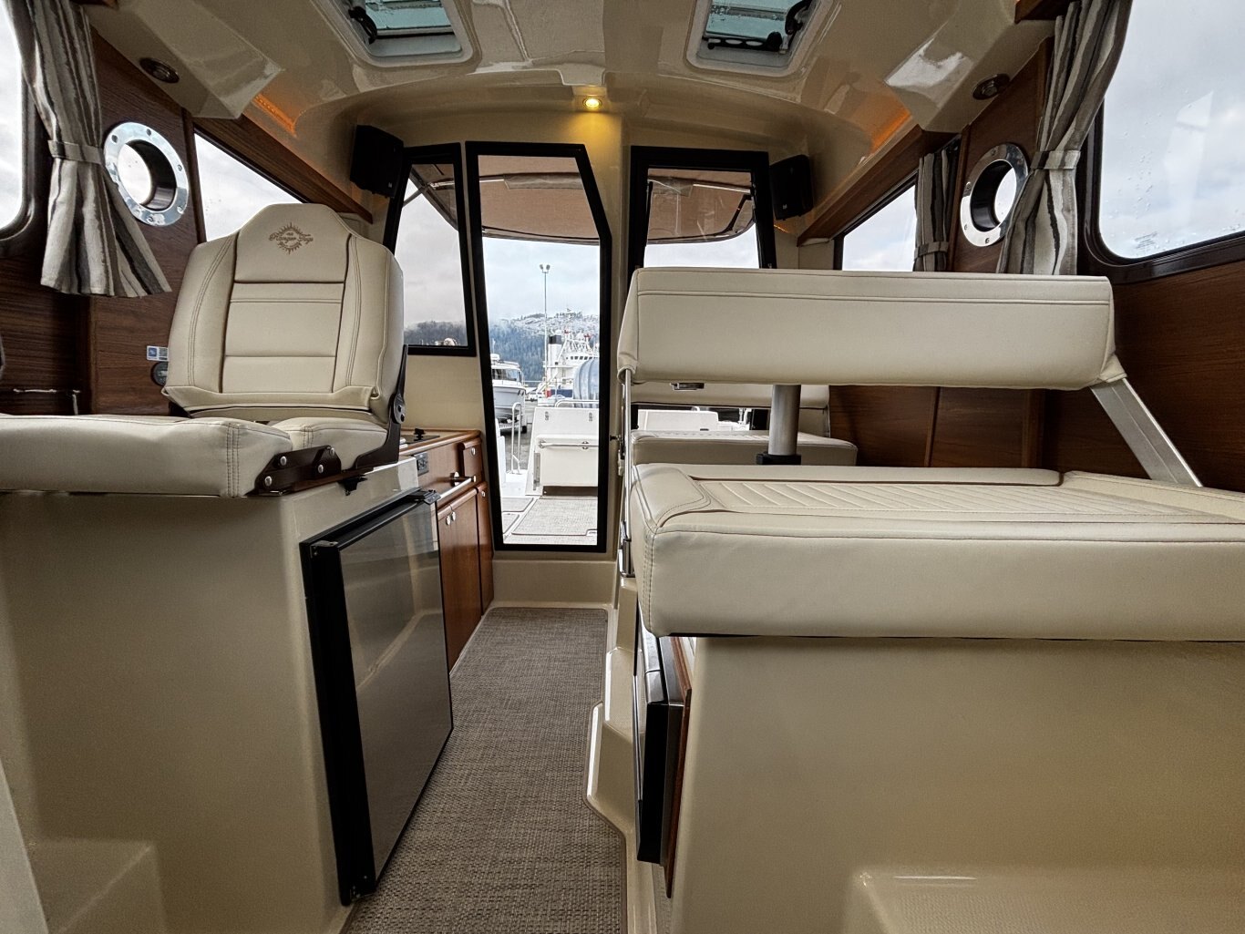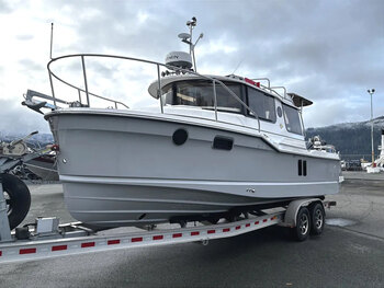 The R-25 is a feature-packed cruiser designed for comfort, ease of use, and FUN! You'll find the Ranger Tugs DNA built into every facet of the R-25's thoughtful design. Right away you'll notice one of the most innovative features of the R-25, our Clear-Path swim platform. The extended swim platform wraps around the outboard lo present a clear walkway free of all engine rigging, which opens a whole new world of fishing, cruising, and water-sports opportunities. This exciting new design features heavy duty handrails and allows you to safely and easily board a dinghy, net a fish, step to or from a low dock (important for pets), and med-tie without fear of damaging your outboard and having to leap to the dock. The main salon on the R-25 is light and bright, making ii a perfect spot lo relax or entertain. The dinette seats four or converts lo a bed far two. The forward stateroom is private and comfortable featuring a large bed, opening hatches for airAow, reading lights, and a TV. The R-25 features a fully enclosed head equipped with an electric marine toilet, sink and shower. There's even a spacious quarter berth with a removable mattress that can be used la accommodate guests/kids or for expanded storage. An electric/ alcohol stove top, refrigerator/freezer combo, microwave, and sink with hot and cold waler, make food prep fun and easy. The easily trailerable Ranger Tugs R-25 is a fantastic boat for cruising, fishing, and fun on the water. The private head, extended swim platform, multiple sleeping areas, and full galley give you everything you need to get away from the dock and spend some serious quality time with (or without) your friends and family.