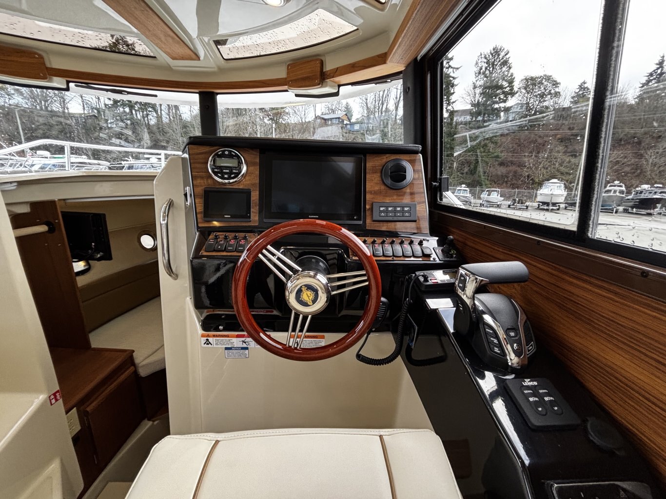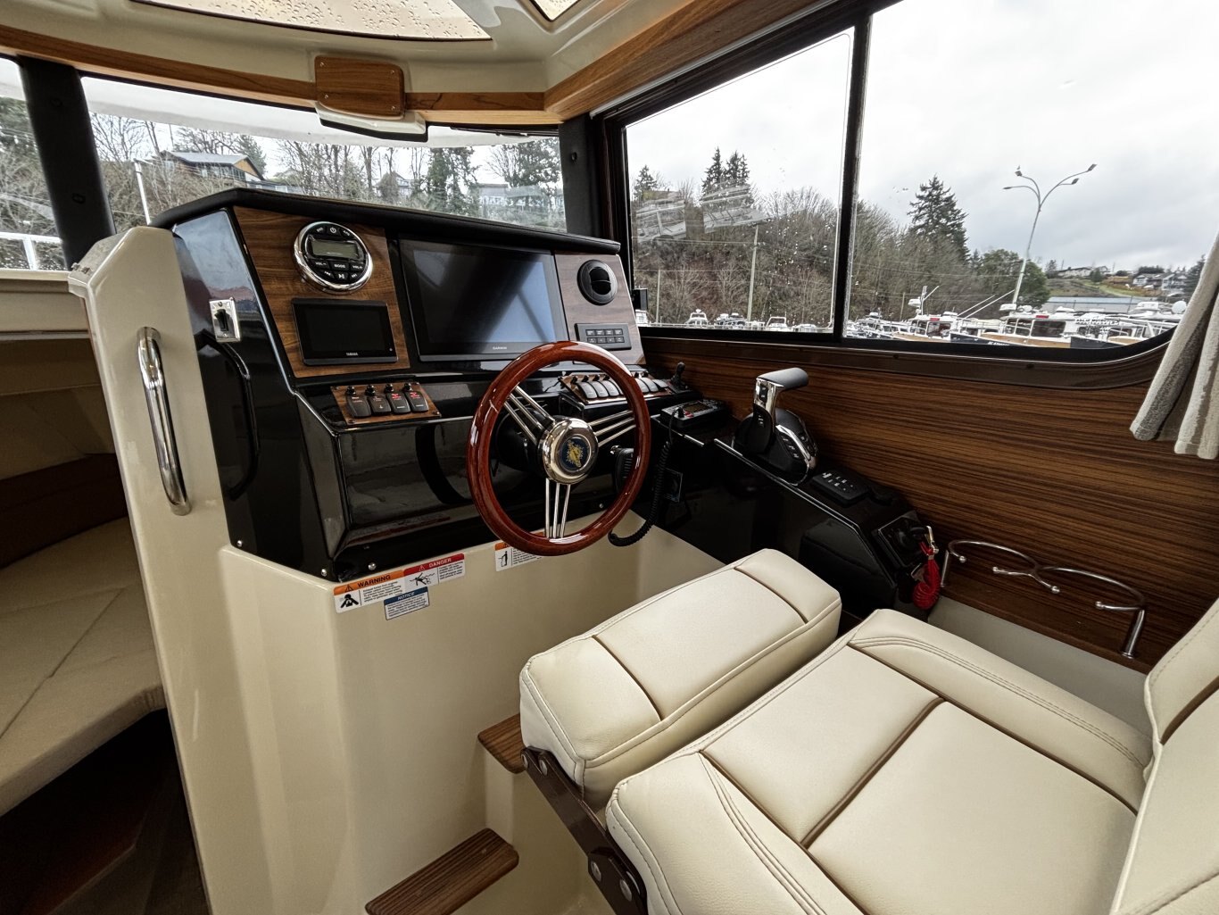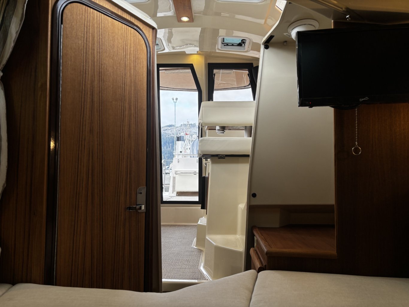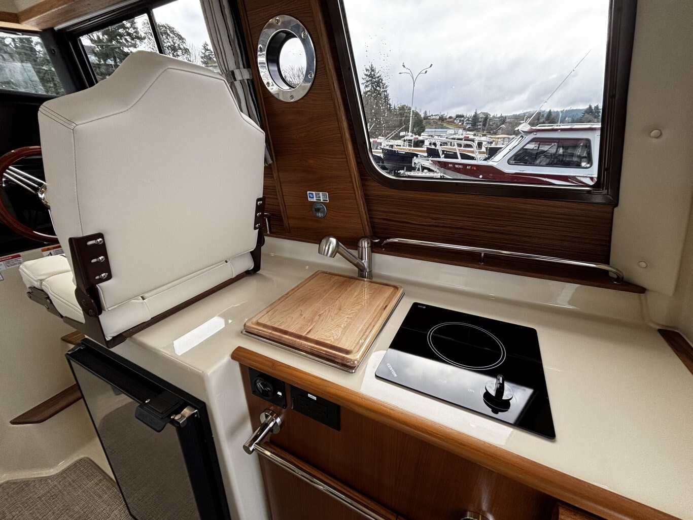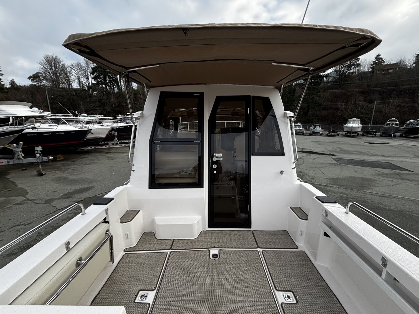The R-25 is a feature-packed cruiser designed for comfort, ease of use, and FUN! You'll find the Ranger Tugs DNA built into every facet of the R-25's thoughtful design. Right away you'll notice one of the most innovative features of the R-25, our Clear-Path swim platform. The extended swim platform wraps around the outboard lo present a clear walkway free of all engine rigging, which opens a whole new world of fishing, cruising, and water-sports opportunities. This exciting new design features heavy duty handrails and allows you to safely and easily board a dinghy, net a fish, step to or from a low dock (important for pets), and med-tie without fear of damaging your outboard and having to leap to the dock. The main salon on the R-25 is light and bright, making ii a perfect spot lo relax or entertain. The dinette seats four or converts lo a bed far two. The forward stateroom is private and comfortable featuring a large bed, opening hatches for airAow, reading lights, and a TV. The R-25 features a fully enclosed head equipped with an electric marine toilet, sink and shower. There's even a spacious quarter berth with a removable mattress that can be used la accommodate guests/kids or for expanded storage. An electric/ alcohol stove top, refrigerator/freezer combo, microwave, and sink with hot and cold waler, make food prep fun and easy. The easily trailerable Ranger Tugs R-25 is a fantastic boat for cruising, fishing, and fun on the water. The private head, extended swim platform, multiple sleeping areas, and full galley give you everything you need to get away from the dock and spend some serious quality time with (or without) your friends and family.